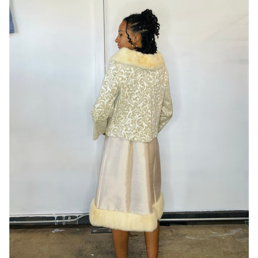 Vintage 60s Lilli Ann brocade tapestry jacket and silk dupioni dress set with mink fur trim / size medium