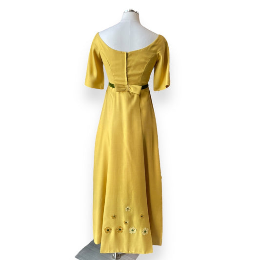 Vintage 60s 70s yellow linen maxi dress velvet flowers XS Small